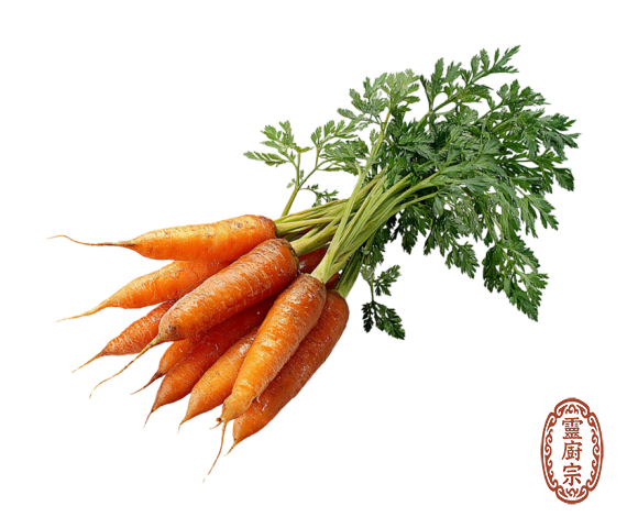 功效方面,胡蘿蔔具有健脾化滯、明目養肝、潤腸通便、補中益氣之效。《本草綱目拾遺》記載其能「補中益氣,安五臟」。其色紅入血,可補血養顏,且甘平不燥,適合脾胃虛弱、視力不佳、皮膚乾燥者食用。